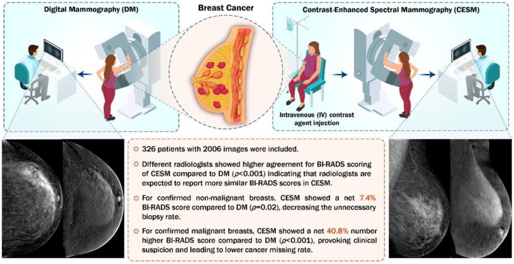 This retrospective study included 326 patients recruited between January 2019 and February 2021. The study protocol was pre-registered on the Open Science Framework platform. Two expert radiologists interpreted the CESM and DM findings. Pathological data are used for radiologically suspicious or malignant-appearing lesions, whereas follow-up was considered the gold standard for benign-appearing lesions and breasts without lesions.
